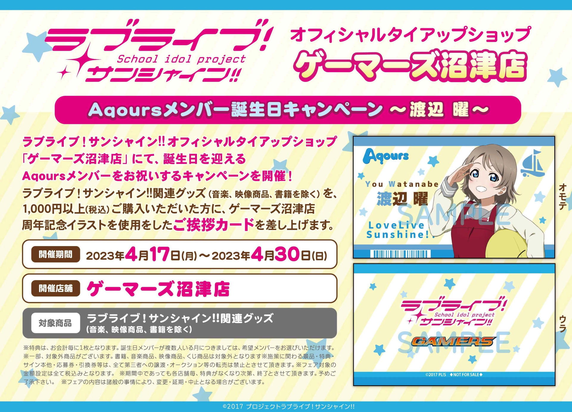 4月17日のAqoursメンバー渡辺 曜バースデーを記念して、『ラブライブ!サンシャイン!!プレミアムショップ』BiVi沼津店、『ラブライブ!シリーズPremiumShop』広島店にて渡辺 曜バースデーグッズの販売とバースデーブロマイドの配布を開始いたします!